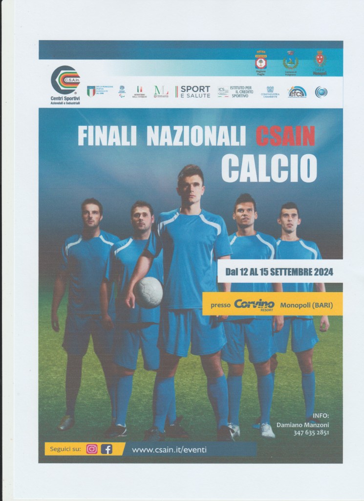 Dal 12 al 15 settembre a Monopoli si svolgeranno le finali nazionali Calcio CSAIn, manifestazione organizzata da CSAIn nazionale in collaborazione con il Comitato Puglia.